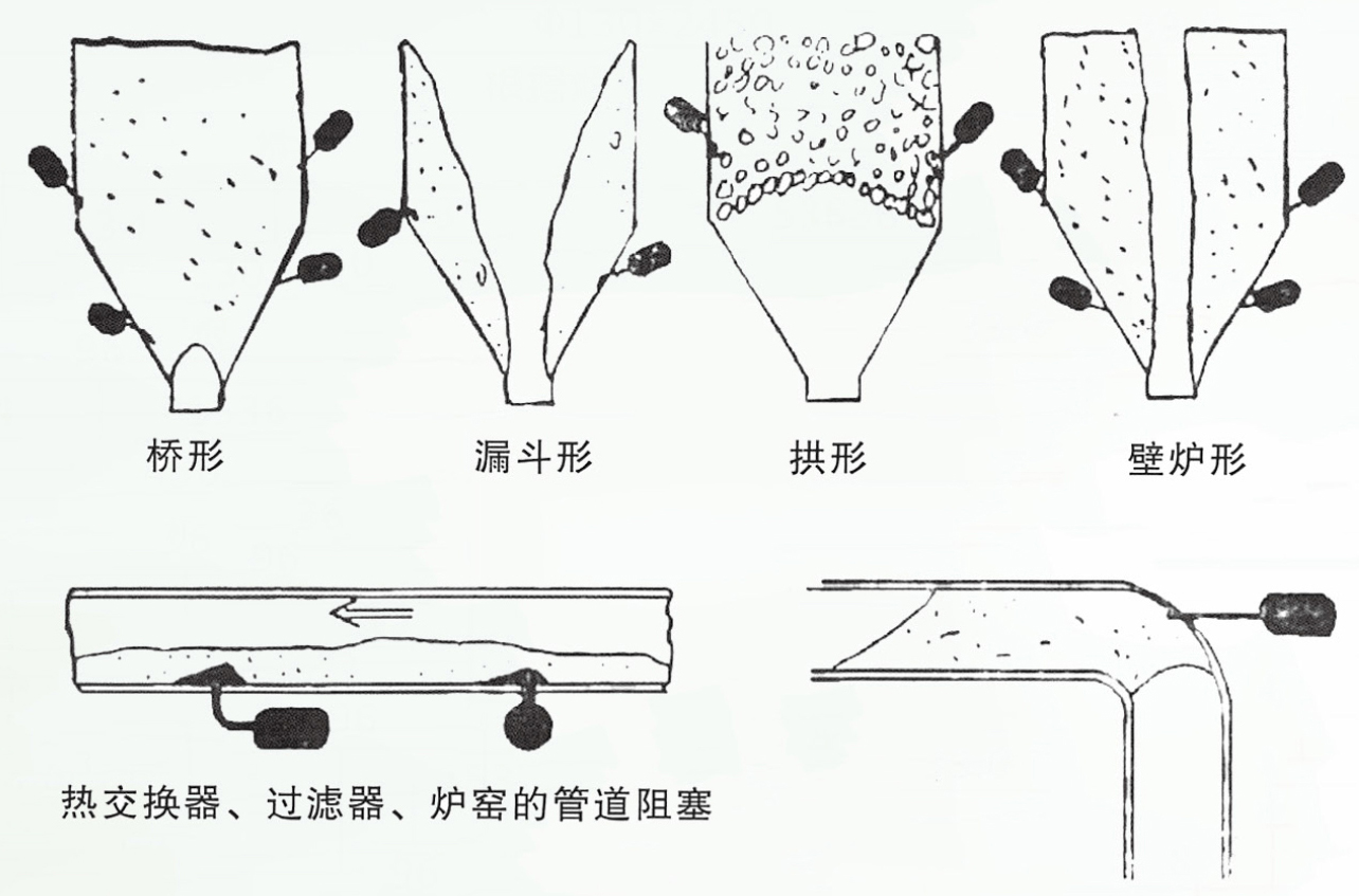 在各種貯料倉內(nèi),貯料由于潮濕、擠壓等原因,可形成不同類型的起拱堵塞。