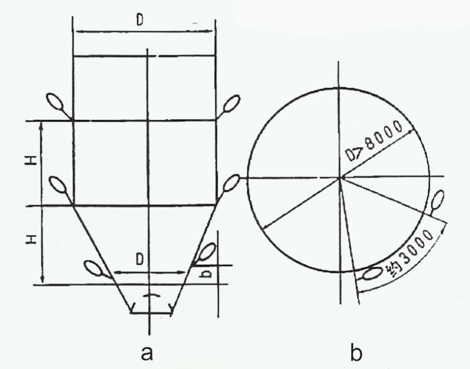 6、在料倉高度方面每隔H =2500mm(或稍大于2000mm)應(yīng)增裝一層空氣炮(圖a),同層圓錐部分空氣炮,希望有一定高度(h ≤900mm);