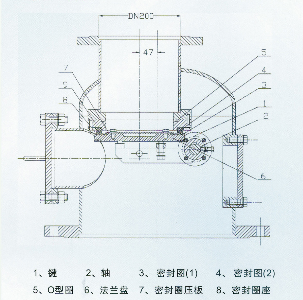 進(jìn)料閥設(shè)置于發(fā)送器頂部,用于發(fā)送器的進(jìn)料進(jìn)行控制。其工作原理是由外部氣缸帶動(dòng)軸作900回轉(zhuǎn)從而帶動(dòng)法蘭盤(pán),當(dāng)法蘭盤(pán)向上時(shí),即關(guān)閉進(jìn)料閥。密封是依靠固定在閥體上密封圈(1)和固定在法蘭盤(pán)封圈(2)的緊密接觸為實(shí)現(xiàn)的。